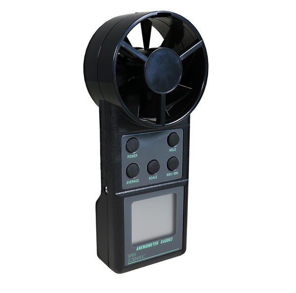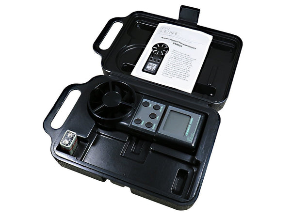 Perfect for use in HVAC, environmental studies, hazardous spill clean ups, electrostatic precipitators, and all types of air flow measurements. Based on the principle that a freely turning turbine will rotate at a speed directly proportional to the wind speed. One piece construction with built-in probe. Select readout in any of 5 scales: meters/second (0.4 to 30), feet per minute (80 to 5900), miles per hour (0.9 to 68), knots (0.8 to 58), or kilometers per hour (1.4 to 108).