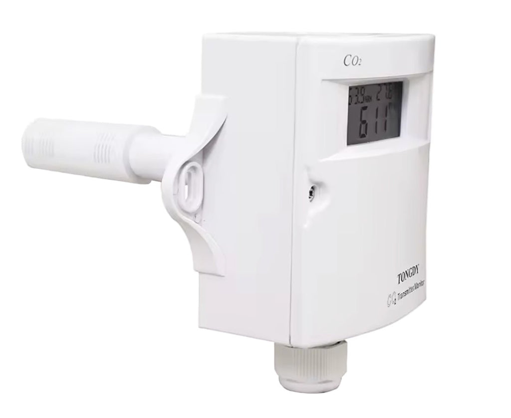 Its specially designed waterproof sensor probe with a porous film ensures easy installation and reliable operation in duct environments. Featuring an easy-to-read LCD display, the unit offers one to three configurable 0-10V or 4-20mA linear outputs. Users can adjust the CO2 measurement range via Modbus RS485 and configure inverse proportional outputs to suit diverse HVAC control applications.