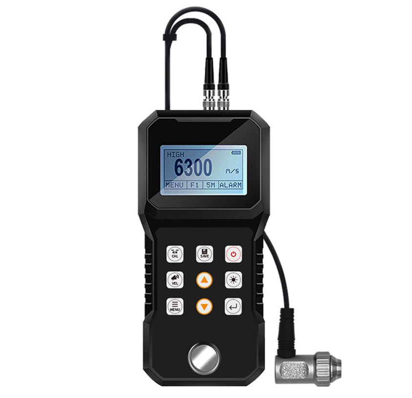 Handheld Ultrasonic Thickness Gauge by BRK with a blue LCD screen and a connected ultrasonic sensor.